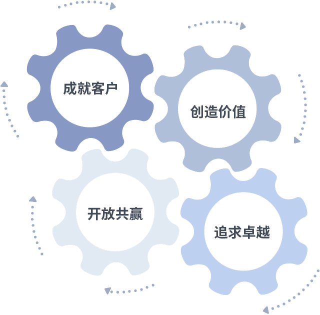 成就客户是一切决策的出发点,,,,创造价值是衡量所有工作的标准,,追求卓越是我们做事做人的态度,,开放共赢是我们的格局也是最终的结果。。。。价值观的齿轮环环相扣,,,推动着组织里的每个人不断向前。。